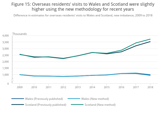 Figure 15: Overseas residents’ visits to Wales and Scotland were slightly higher using the new methodology for recent years