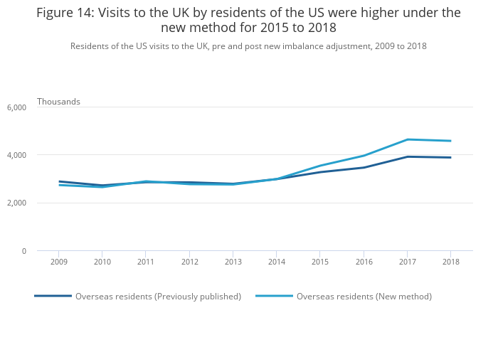 Overseas residents’ visits to the UK were 4% higher for 2009 under the new method than the previous method (increasing from 29.9 million to 31.1 million), rising to a larger increase of 6% in 2018 (from 37.9 million to 40.3 million visits).