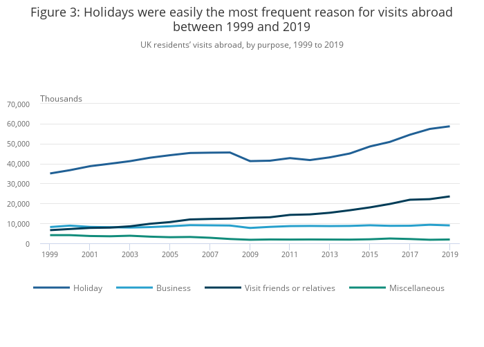 Figure 3: Holidays were easily the most frequent reason for visits abroad between 1999 and 2019