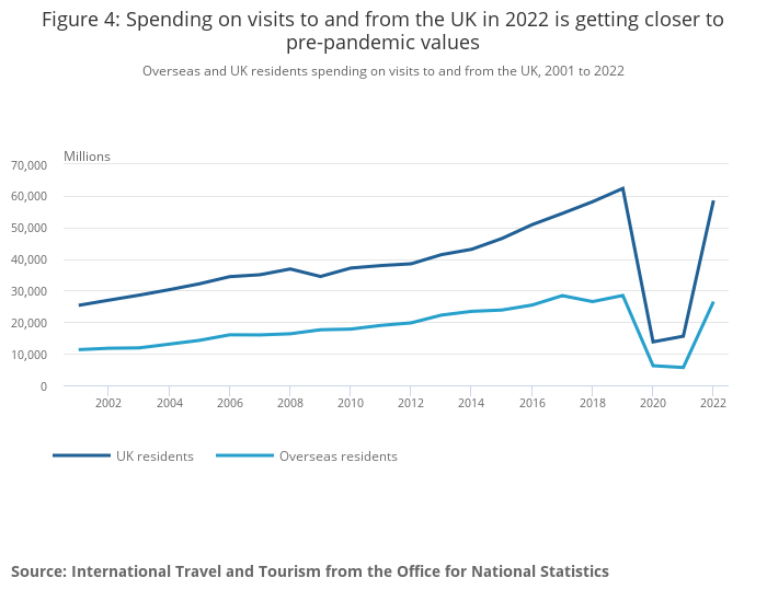 Overseas and UK residents spending on visits to and from the UK, 2001 to 2022