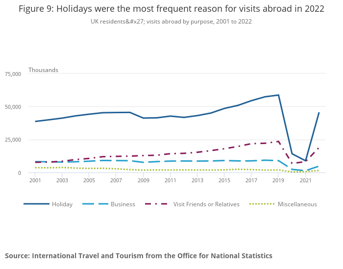 UK residents' visits abroad by purpose, 2001 to 2022