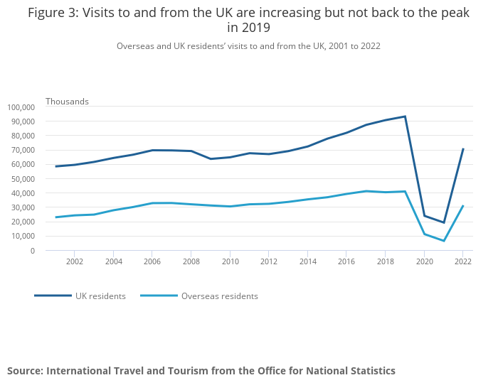 Figure 3: Visits to and from the UK are increasing but not back to the peak in 2019
