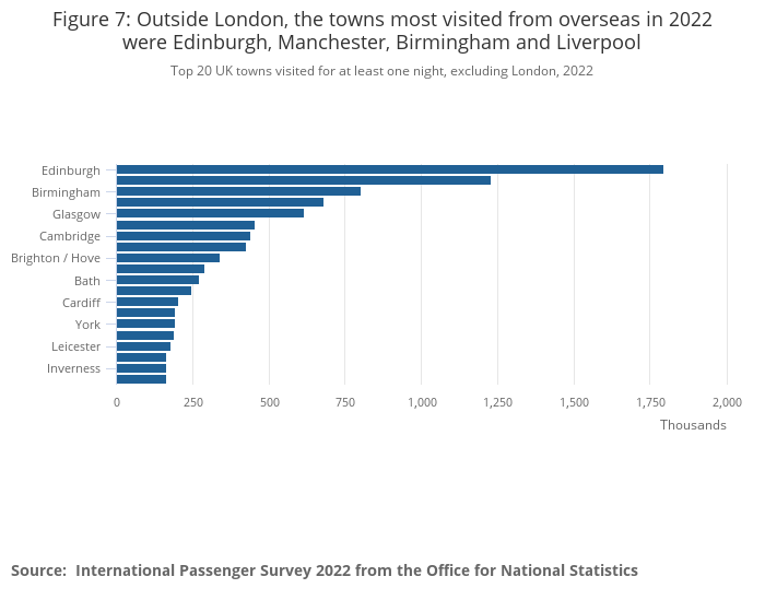 Figure 7: Outside London, the towns most visited from overseas in 2022 were Edinburgh, Manchester, Birmingham and Liverpool