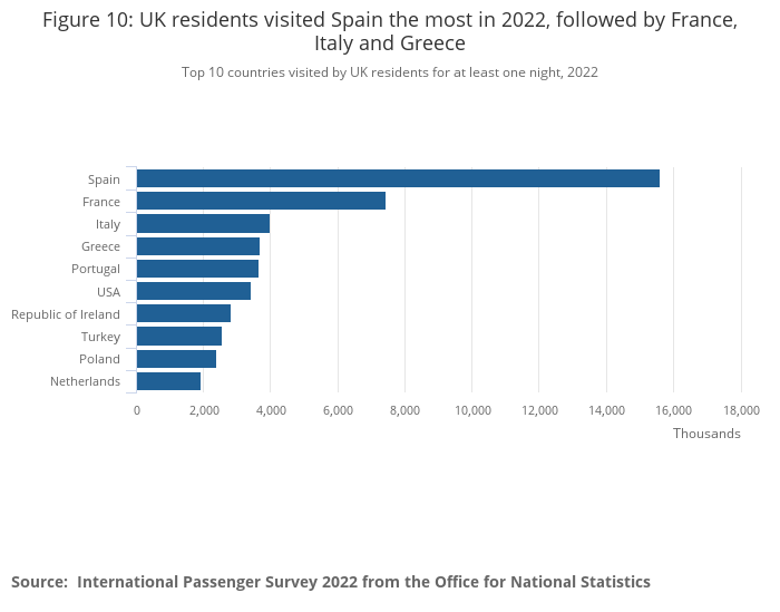 Figure 10: UK residents visited Spain the most in 2022, followed by France, Italy and Greece
