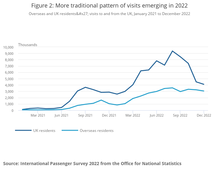 Overseas and UK residents' visits to and from the UK, January 2021 to December 2022
