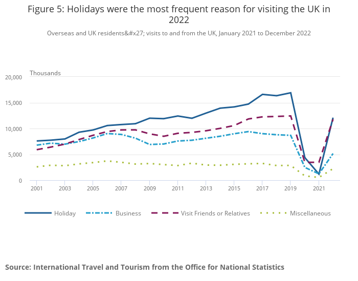 The most frequent reason for visits was for holidays, both for UK residents visiting abroad and overseas residents visiting the UK; this has reverted to a more traditional reason after the coronavirus pandemic, when the most common reason for travel was to see friends and relatives.