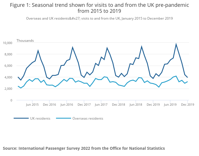 Figure 1: Seasonal trend shown for visits to and from the UK pre-pandemic from 2015 to 2019