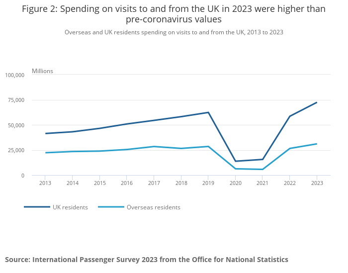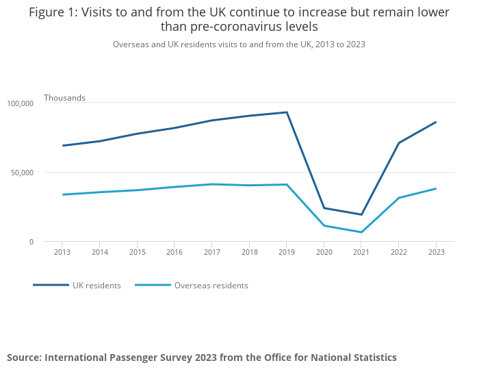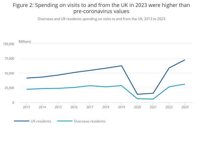 Overseas residents’ visits to the UK and UK residents’ visits abroad remain lower than pre-coronavirus (COVID-19) pandemic levels from 2019; however, spending was higher in 2023 than in 2019 for both groups.