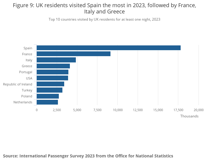 Figure 9: UK residents visited Spain the most in 2023, followed by France, Italy and Greece