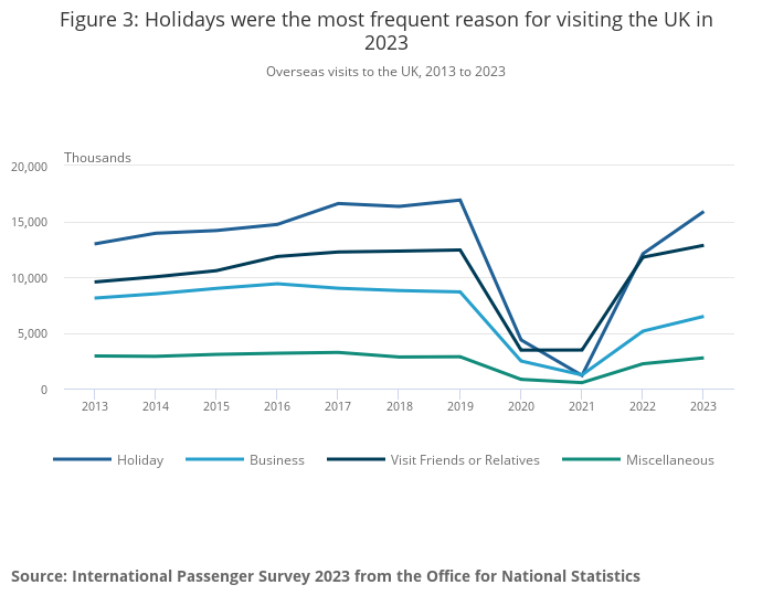 Figure 3: Holidays were the most frequent reason for visiting the UK in 2023