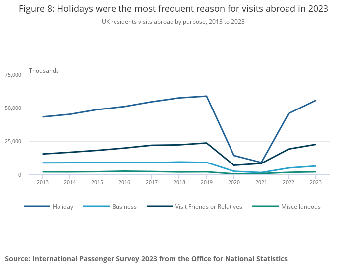 Spending was higher than pre-coronavirus levels in 2023. Estimated spending abroad by UK residents increased by 16% from £62.3 billion in 2019 to £72.4 billion in 2023. UK residents spent £50.0 billion on holidays, with an additional £13.9 billion spent on visiting friends or relatives. This does not factor in inflation.