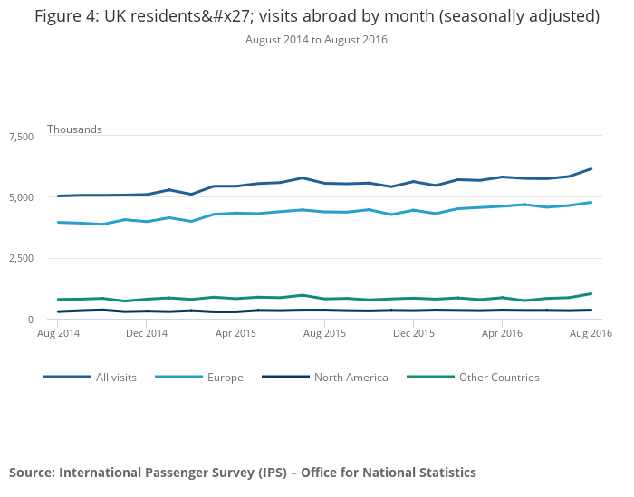 In the 12 months to August 2016, the number of visits abroad by UK residents was 7% higher when compared with a year earlier; expenditure on these visits also increased by 9% during this period. Visits to North America, Europe and other countries rose by 4%, 8% and 1% respectively. Travelling abroad grew across the range of reasons for visiting, including holidays (5%), business (3%) and visits to friends and relatives (12%).