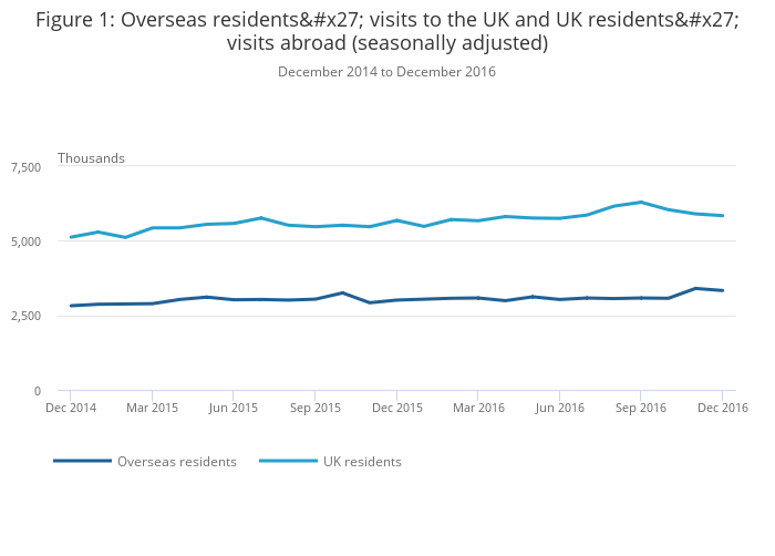 Overseas residents made 9.2 million visits to the UK in the 3 months to December 2016. This was 6% higher than the same 3 months in 2015. The amount spent on these visits was unchanged at £5.3 billion.