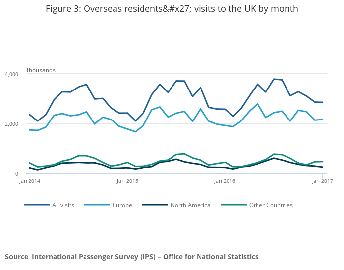 In the 3 months to January 2017, overseas residents made 22% more visits to the UK for holidays than the same period a year ago.