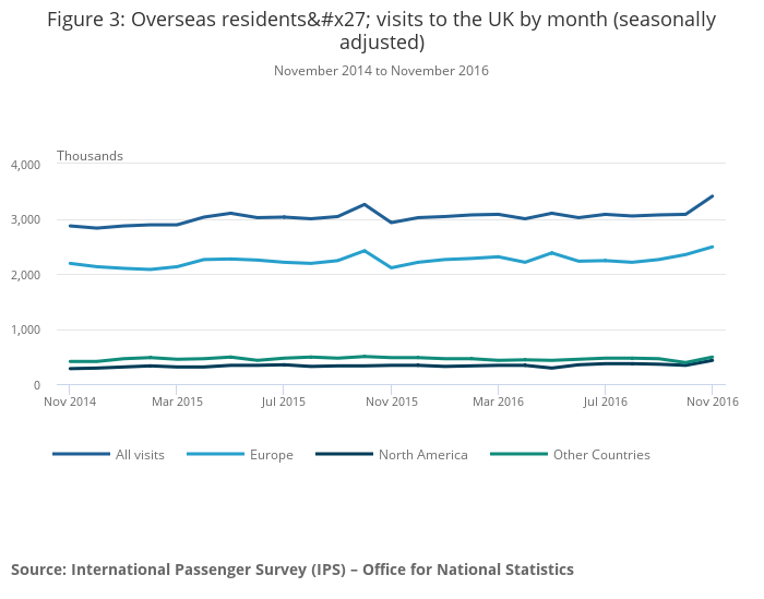 Overseas residents made 9.5 million visits to the UK in the 3 months to November 2016. This was 3% higher than the same 3 months in 2015.