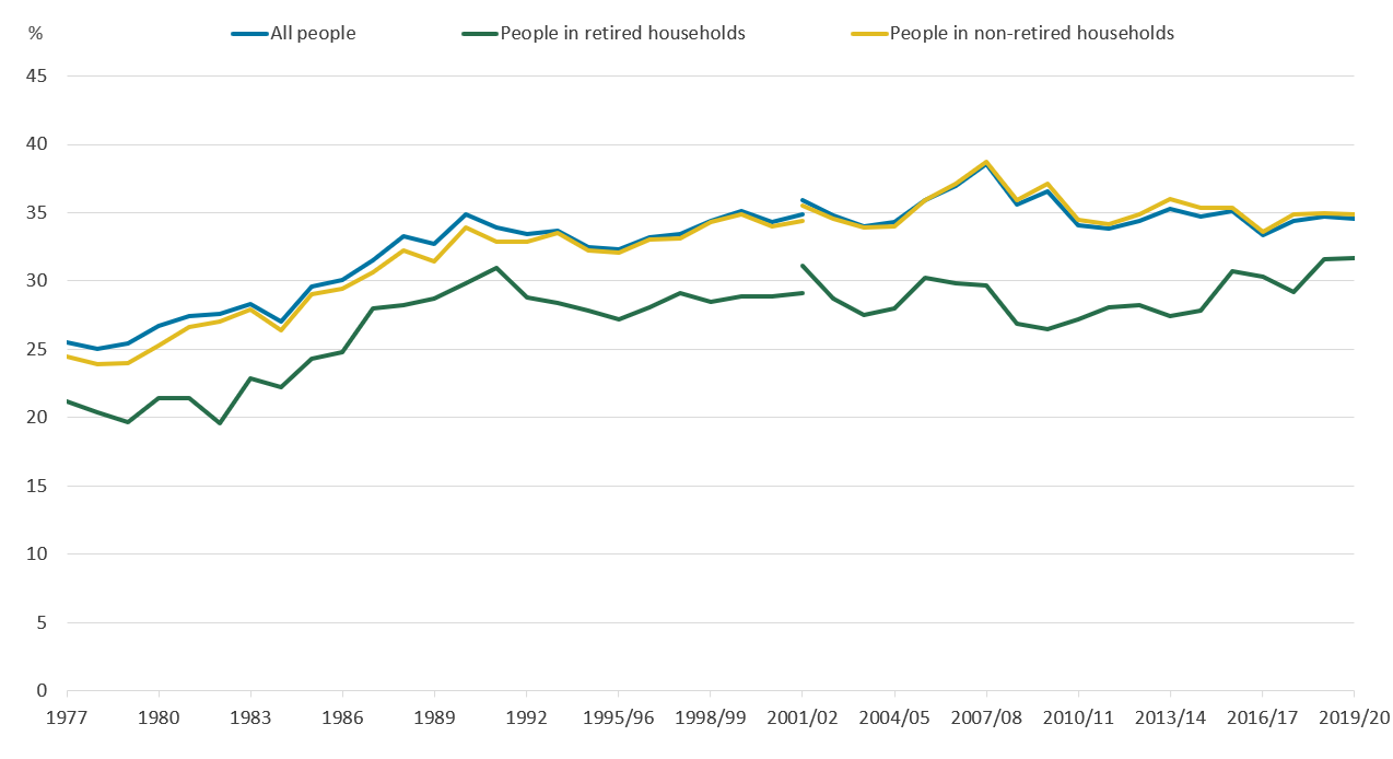 Levels of income inequality for both retired and non-retired people increased during the late 1990s. While there has been some volatility, income inequality for individuals in non-retired households has remained broadly similar to that reached in FYE 2011. In recent years, income inequality for retired people has increased by an average of 0.8 percentage points per year since FYE 2015. Comparatively, income inequality for individuals in non-retired households has reduced by 0.1 percentage points.