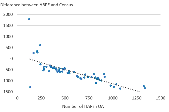 Figure 4: Higher HAF population is linked with the ABPE being lower than the Census
