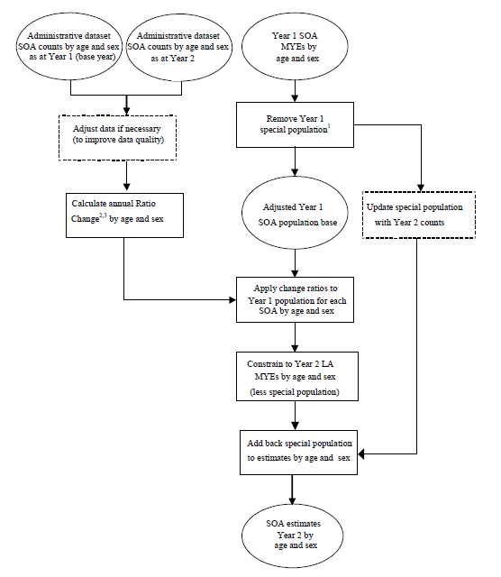 This section details the ratio change (Super Output Area (SOA)) and apportionment approach (Output Area (OA)) methodologies used to produce small area population estimates in intercensal years. In a census year, population estimates are produced from census estimates and are aged forward and adjusted to account for differences between census day and the mid-year (30 June) and usual residence definitions. Following a census, rolled-forward estimates for the intercensal years are revised to account for population change over this period and to provide a consistent time series of population estimates. More details on the one-off methods used to produce estimates in census years and make the revisions to the estimates for the period mid-2002 to mid-2010 are included in Appendix A and Appendix B respectively.