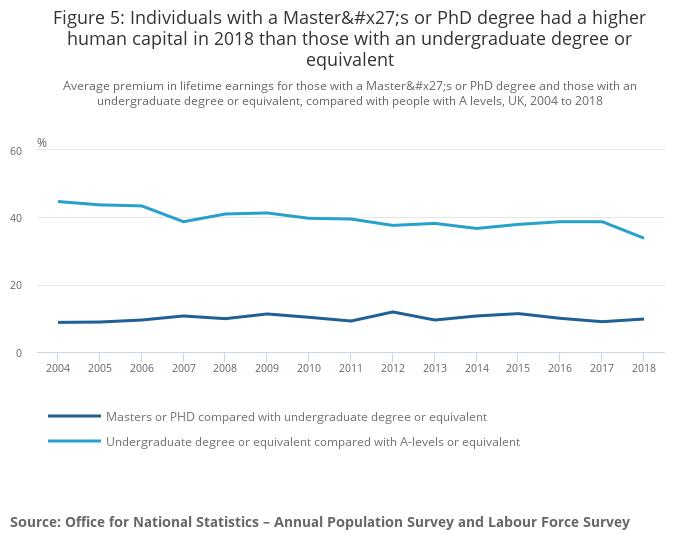 Average premium in lifetime earnings for those with a Master's or PhD degree and those with an undergraduate degree or equivalent, compared with people with A levels, UK, 2004 to 2018