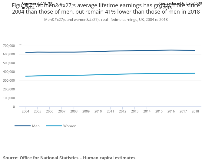 Download this chart Figure 7: Women's average lifetime earnings has grown more since 2004 than those of men, but remain 41% lower than those of men in 2018