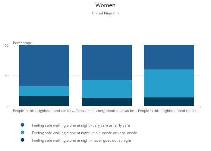 However, 40% of women and 71% of men who reported not trusting others in their local area nevertheless felt very or fairly safe walking alone in their local area. Similarly, 46% of women who felt that people in their local area did not get on reported feeling very or fairly safe walking alone after dark in their local area (Source: Understanding Society, 2011/12). Similar trends can be observed for the measure on feeling that the local area is a close-knit community; these findings suggest that although trust in others, feelings that people get on in their local area and forming a close-knit community are important, they are not enough to explain why people feel safe walking alone in their local area after dark.