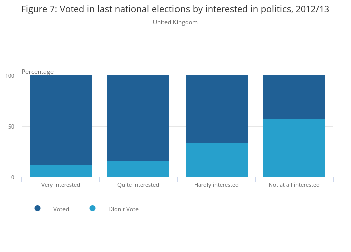 Download this chart Figure 7: Voted in last national elections by interested in politics, 2012/13