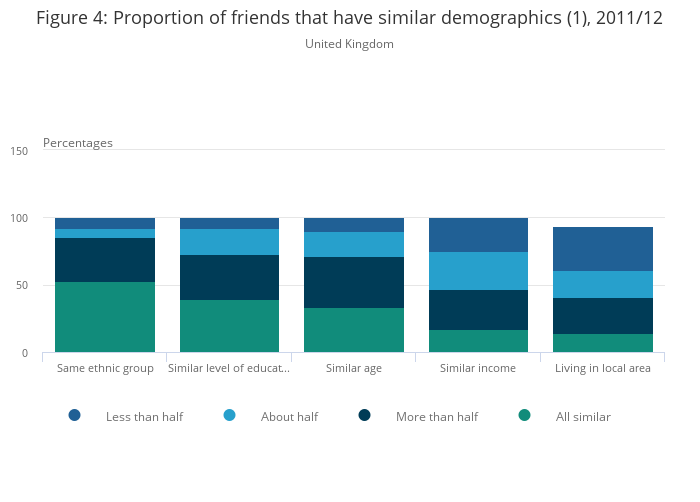 Over half (53%) of adults aged 16 and over in the UK in 2011/12 reported that all their friends were of the same ethnic group. A third (33%) reported that all their friends were of a similar age while 39% reported their friends had a similar level of education.