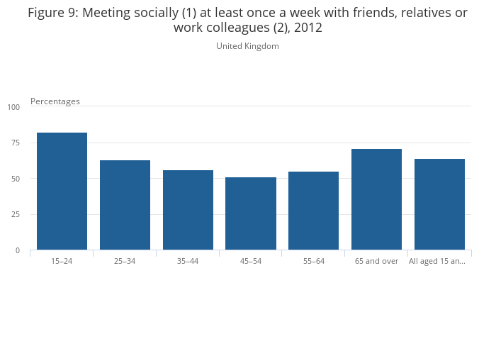Image .csv .xlsThe 2012 European Social Survey People asked those aged 15 and over in the UK how often they met socially with friends, relatives or work colleagues. Over 6 in 10 (63%) reported that they met socially once a week or more3 (Figure 9). Unsurprisingly, those aged 15 to 24 were more likely than other age groups to report that they met socially at least once a week, while those aged 35 to 64 were least likely to socialise with friends, relatives or work colleagues once a week or more. This was probably due to people in this age group having childcare or work commitments.