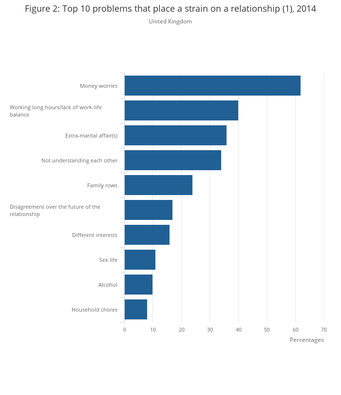 - Respondents aged 16 and over were asked 'Which three of the following 17 problems do you think places the most strain on a relationship?' (Please rank these options in order). This chart shows the first ten problems only and does not include those who stated ‘Don’t know’.