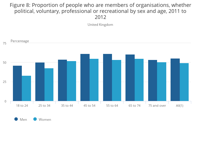 Figure 8: Proportion of people who are members of organisations, whether political, voluntary, professional or recreational by sex and age, 2011 to 2012