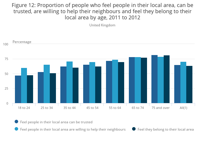 Those aged 18 to 24 were also less likely to stop and talk with their neighbours and borrow things and exchange favours with their neighbours, as shown in this article. Less than half (47%) of those aged 18 to 24 reported feeling that they belong to their local area, compared with around 8 in 10 people (81%) of those aged 75 and over.