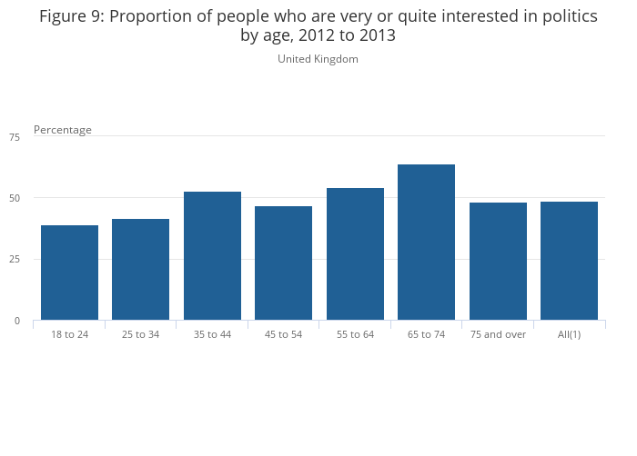 Interest also differed across age bands (Figure 9). The youngest age group was the least likely to be interested in politics, which reflects the voter turnout results; around 39% of those aged 18 to 24 and 42% of those aged 25 to 34 reported being very or quite interested in politics in 2012 to 2013 . People in the 65 to 74 age group were the most likely to be very or quite interested in politics (64%), which is in line with our previous findings (2014). Whether people are more or less likely to feel they have any say over how governments run the country may be an important factor to their continued political interest (ONS, 2014b).