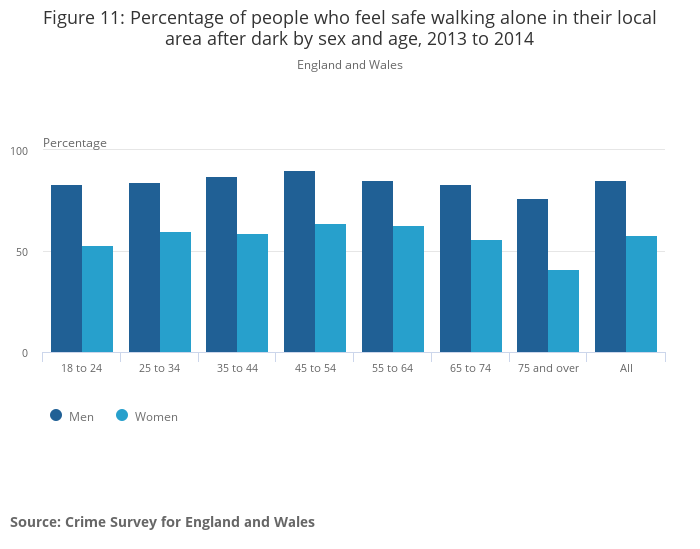 - Fewer women than men reported feeling safe walking alone in their local area (58% compared to 85% in 2013 to 2014).
