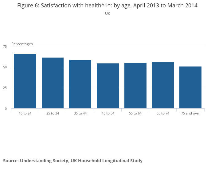 Satisfaction with health in the UK fell from 66.3% in the financial year ending 2011 to 57.8% in the financial year ending 2014.