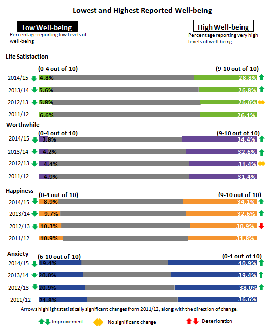 Improvement across all 4 measures suggests that more people in the UK are feeling positive about their lives than in the financial year ending 2014. The Personal Well-being in the UK, 2014/15 statistical bulletin discusses these measures in more detail.