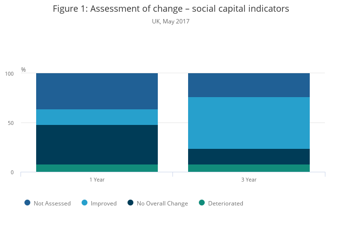 The most recent data show a largely positive picture of social capital in the UK over the longer-term with over half of the indicators showing improvement over a period of 3 years; a majority of indicators showed improvement or no overall change over the shorter-term 1 year assessment.