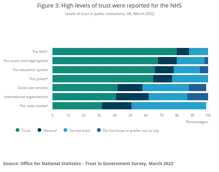 Trust in public services was higher than trust in the national or local governments, with the NHS the most trusted public service (80%), followed by the courts and legal system (68%).