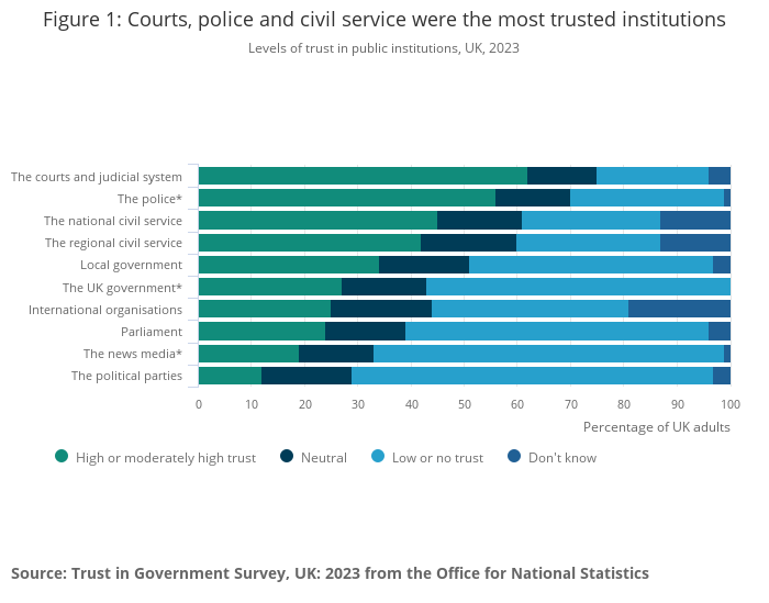 People in the UK trust non-political institutions, such as the judicial system, police and civil service, more than the national and devolved governments, Parliament and political parties.