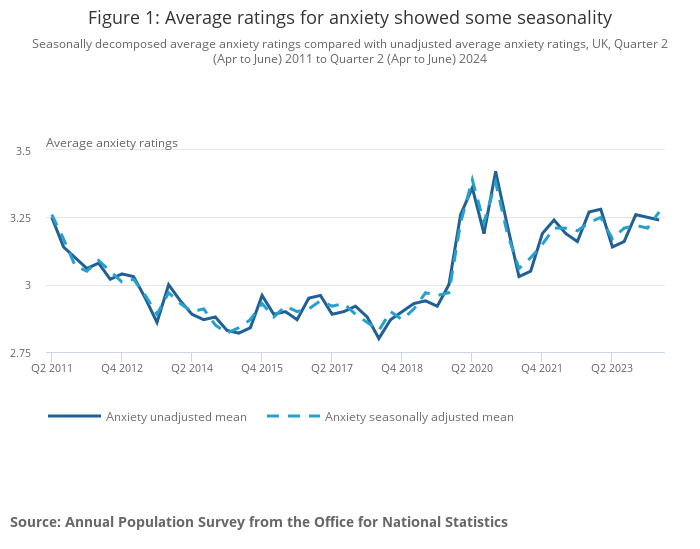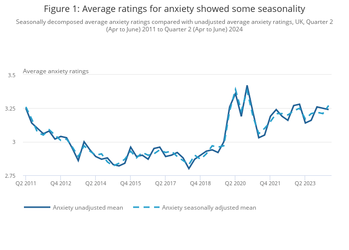 Seasonally decomposed average anxiety ratings compared with unadjusted average anxiety ratings, UK, Quarter 2 (Apr to June) 2011 to Quarter 2 (Apr to June) 2024