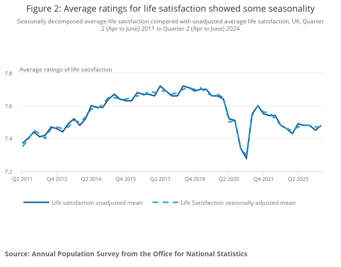 Seasonally decomposed average life satisfaction compared with unadjusted average life satisfaction, UK, Quarter 2 (Apr to June) 2011 to Quarter 2 (Apr to June) 2024