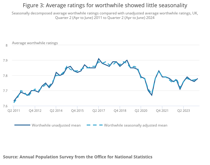 Seasonally decomposed average worthwhile ratings compared with unadjusted average worthwhile ratings, UK, Quarter 2 (Apr to June) 2011 to Quarter 2 (Apr to June) 2024